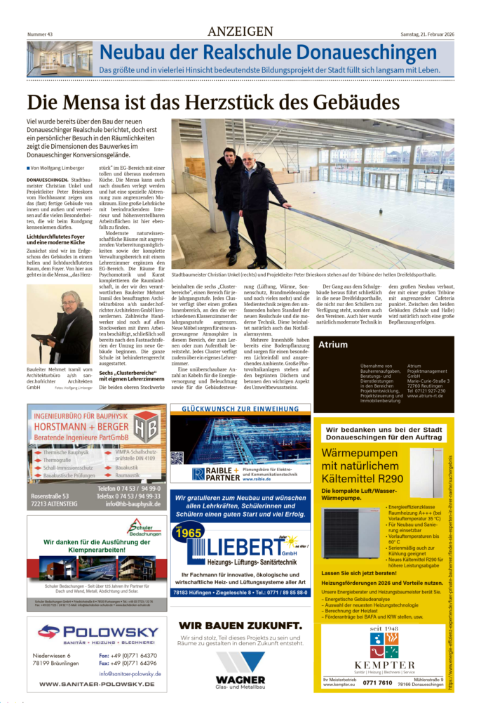 Anlässlich der Fertigstellung erschien zudem eine Sonderveröffentlichung im Schwarzwälder Bote, die sich ausführlich mit dem Neubau der Realschule in Donaueschingen und den beteiligten Projektpartnern befasst.